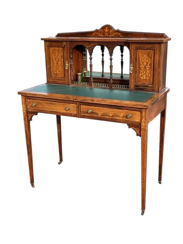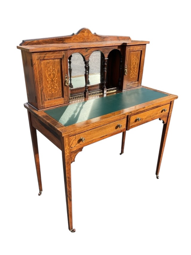 An Edwardian rosewood bonheur-de-jour inlaid with foliate scrolled decoration, the back with shaped upstand and bevelled mirror enclosed by arcaded columns flanked by panelled cupboards, the base with two frieze drawers raised on square tapering legs on pot castors. (36in x 18in x 45in)