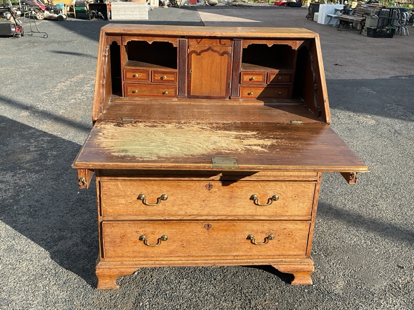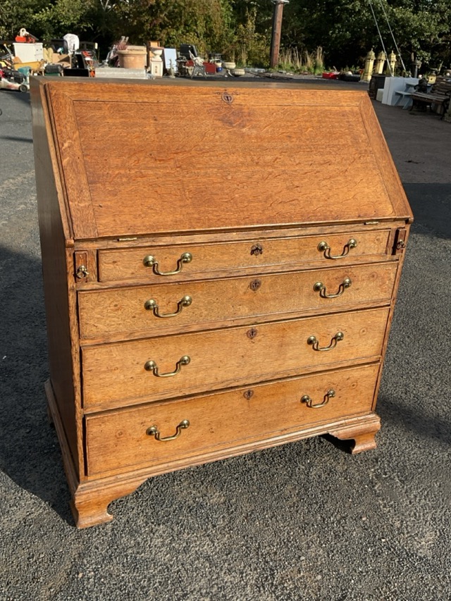 A George III oak bureau with panelled fallfront enclosing a fitted interior with central cupboard, drawers and pigeonholes, the desk with four long cockbeaded drawers raised on bracket feet. (36.5in x 22.5in x 42.5in)