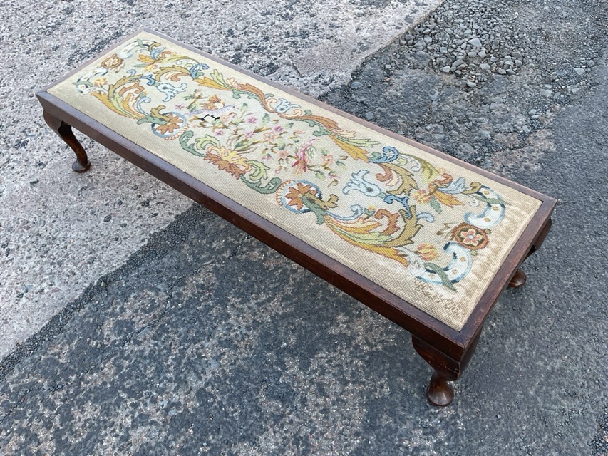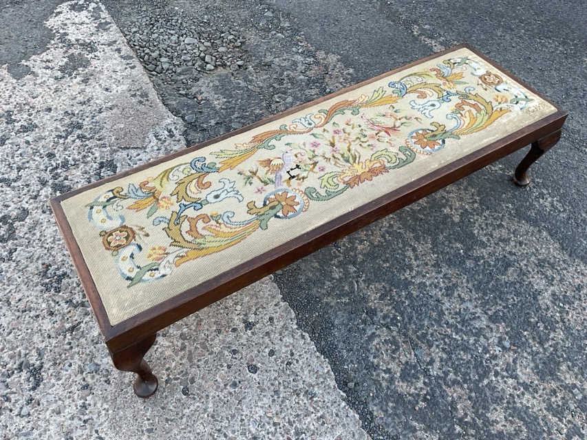 A rectangular stained long stool on cabriole legs, the needlework tapestry seat with birds & flowers in scrolled panel. (44in)