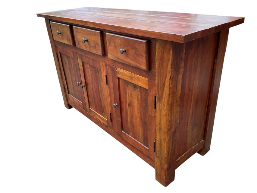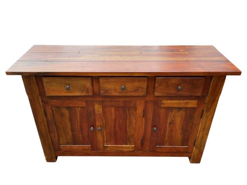 A hardwood dresser with rectangular grooved top above three frieze drawers and panelled cupboards - all mounted with knobs, raised on square chamfered column legs. (59.25in x 19.75in x 35.5in)