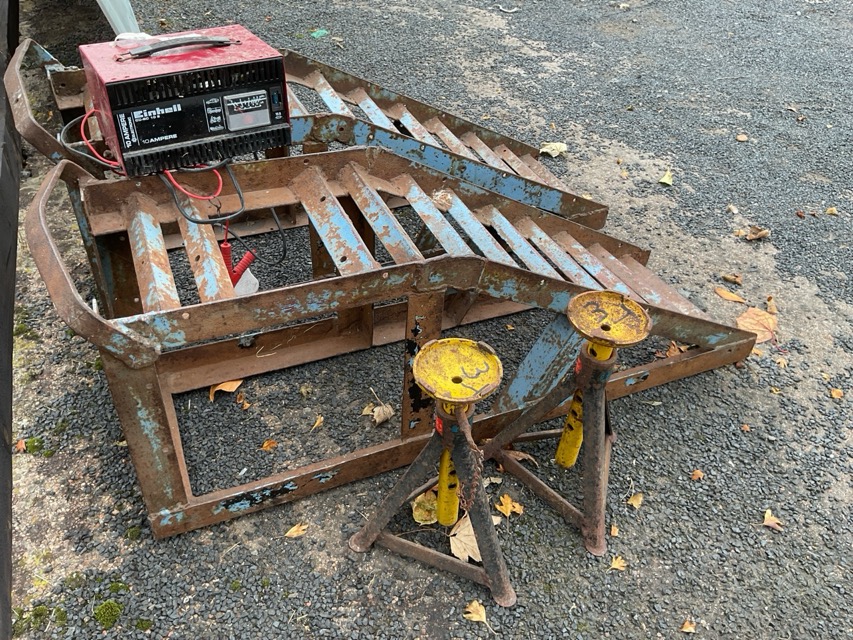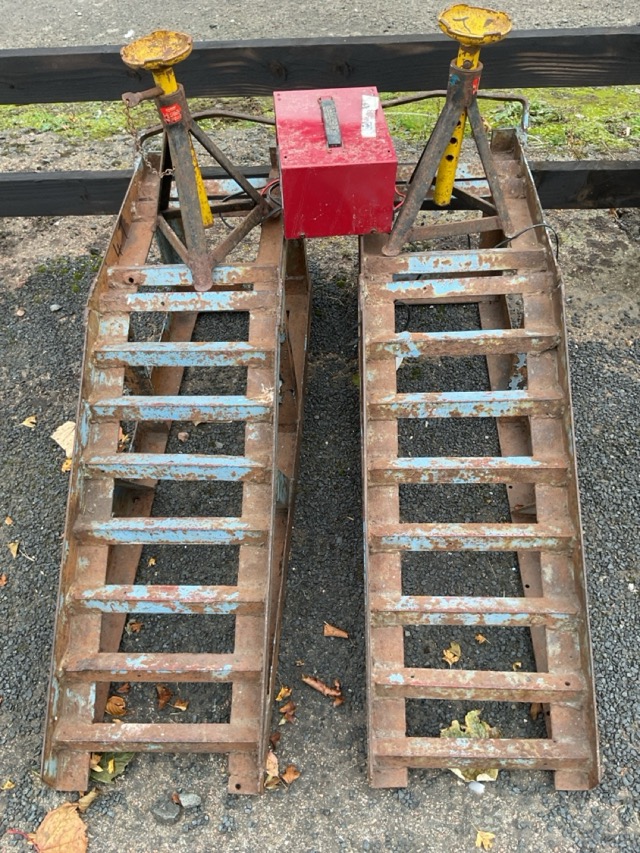 A pair of angleiron type vehicle ramps; a Eintell electric 10amp battery charger; and a pair of pyramidal car jacks with adjustable columns. (3)