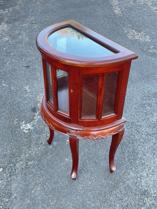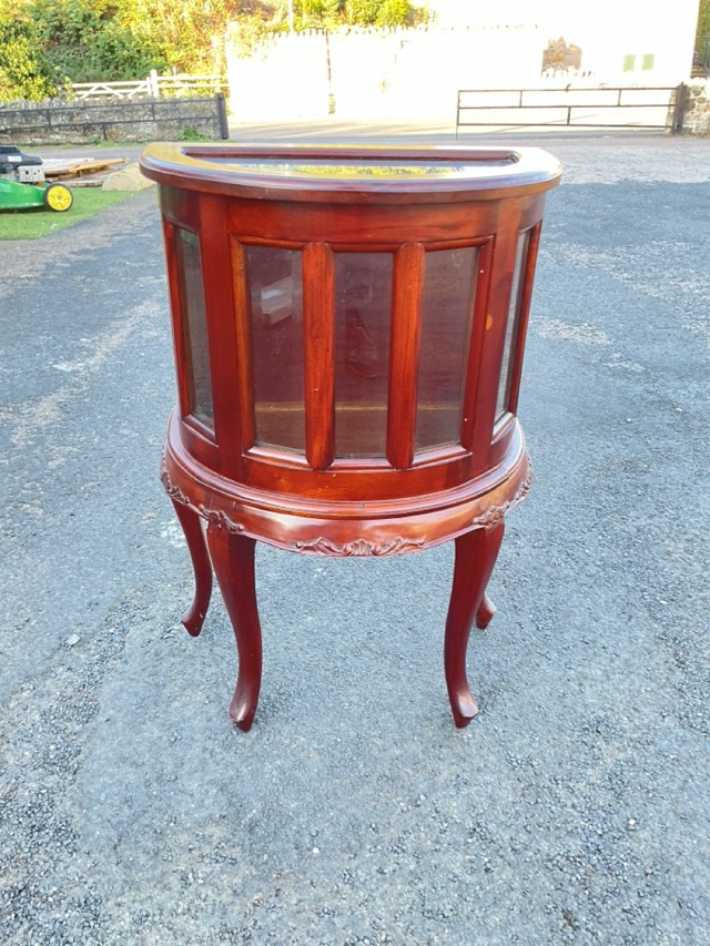 A mahogany bijouterie cabinet of moulded D-shape outline having hinged cover above seven bevelled glass panels, the apron with foliate scrolled carving raised on cabriole legs. (19in x 11.5in x 28.75in)