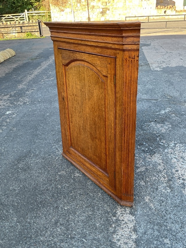 A nineteenth century oak corner cabinet with moulded cornice above an arched fielded panelled door enclosing shaped shelves, framed by fluted canted pillasters. (36in x 20in x 41.5in)