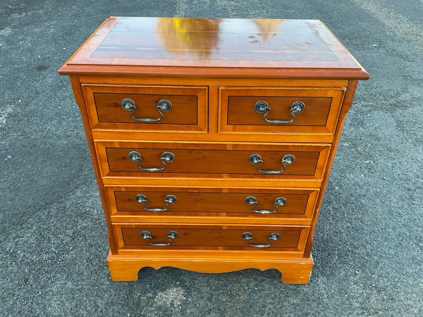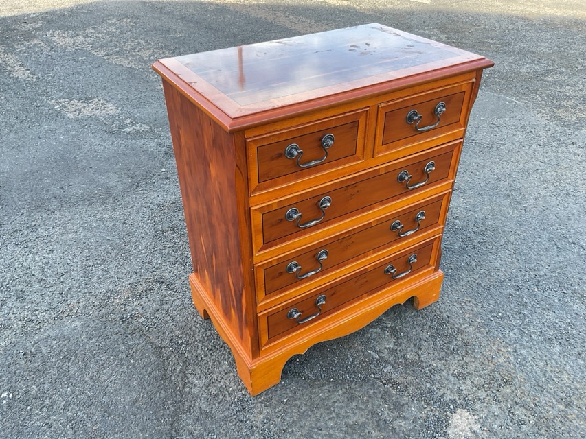 A small Georgian style yew chest with two short and three long drawers raised on bracket feet, the cockbeaded drawers & moulded top with crossbanding. (24in x 14.5in x 27.25in)