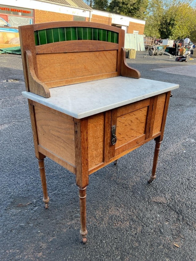 An art nouveau oak washstand, the back with arched tiled panel above a marble slab, the base with panelled cupboard, raised on turned legs with castors. (30.25in x 16.75in x 40.5in)