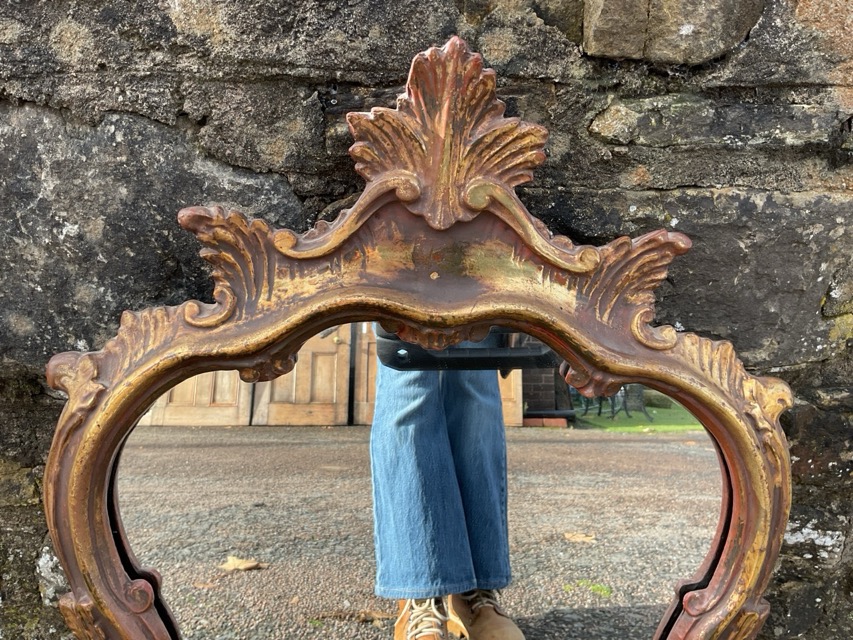 A Georgian style mirror in leaf scrolled burnished gilt waisted frame surmounted by leaf crest. (19.75in x 26in)