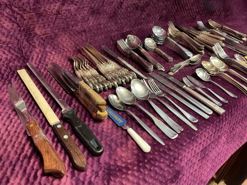 Miscellaneous silver plated, stainless steel, and chromed cutlery including a set of early Victorian fruit knives and forks by Elkington, sets and part sets of dessert and soup spoons, dessert, fish, and table knives and forks, carving and kitchen knives, tea knives, Viners, Arthur Price, etc. (A lot)