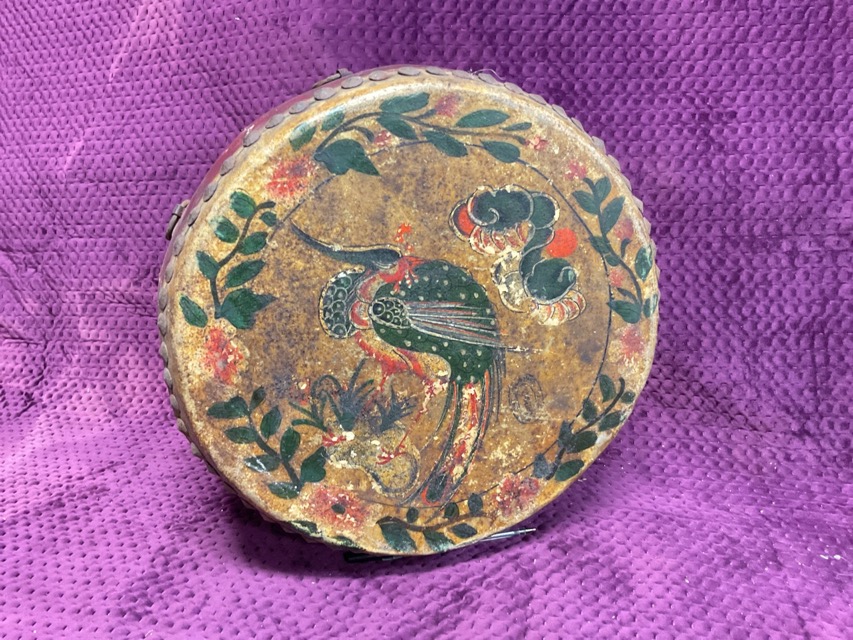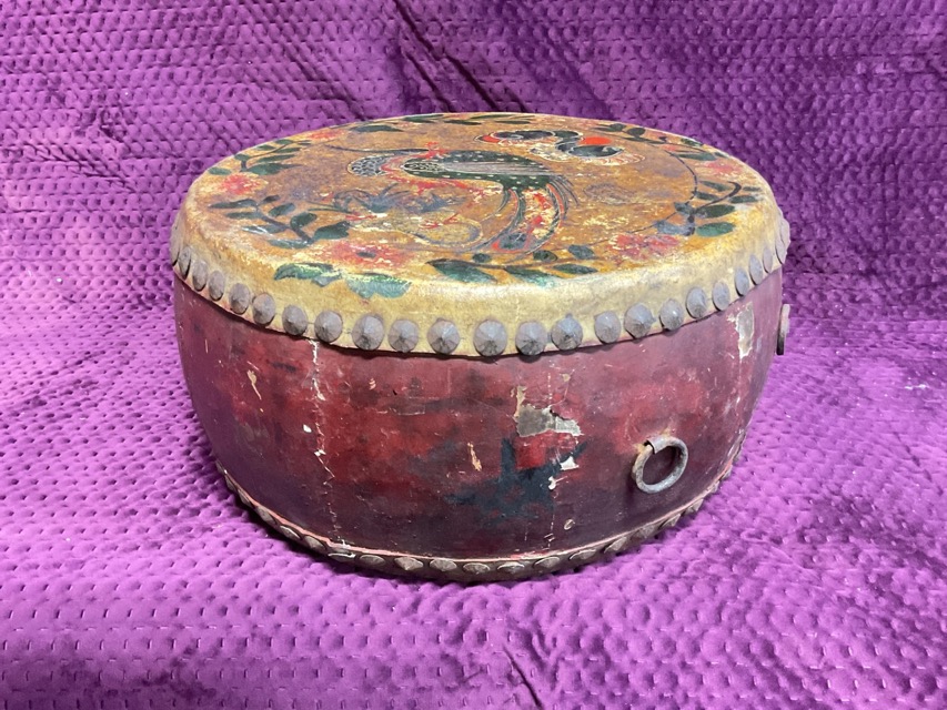 An antique Chinese Bangu drum with red lacquered body, iron suspension loops and studded skins handpainted with a dragon and a phoenix within flowering vine borders. (16in x 16in x 7.5in)