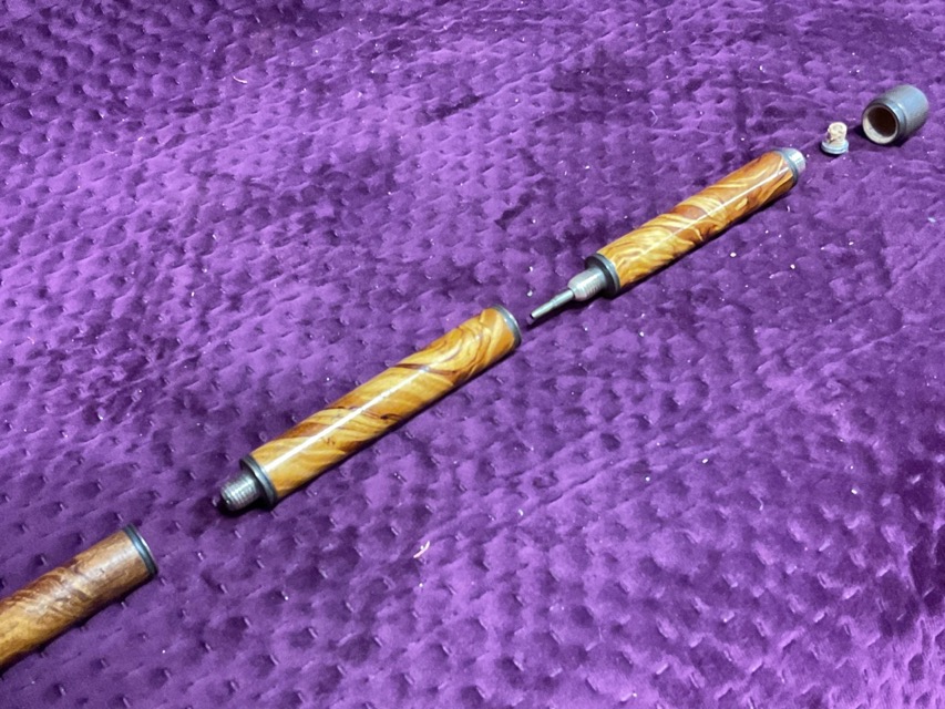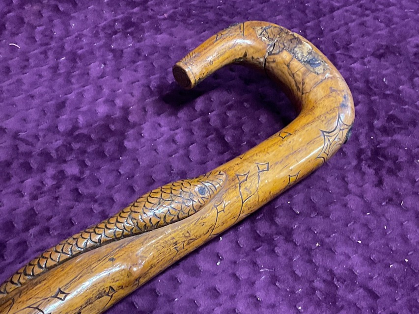 A carved elm walking stick in the form of a serpent entwining an ivy-clad tree trunk with crook handle - 38in; and a Victorian marbled hardwood cane with sectional handle unscrewing to a small stoppered glass vial, a pencil, and a compartment - 34.5in. (2)