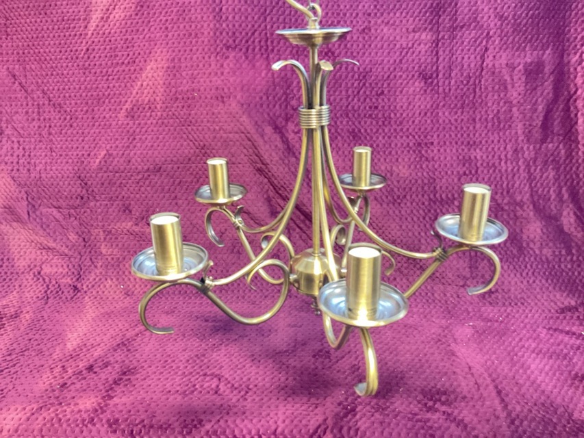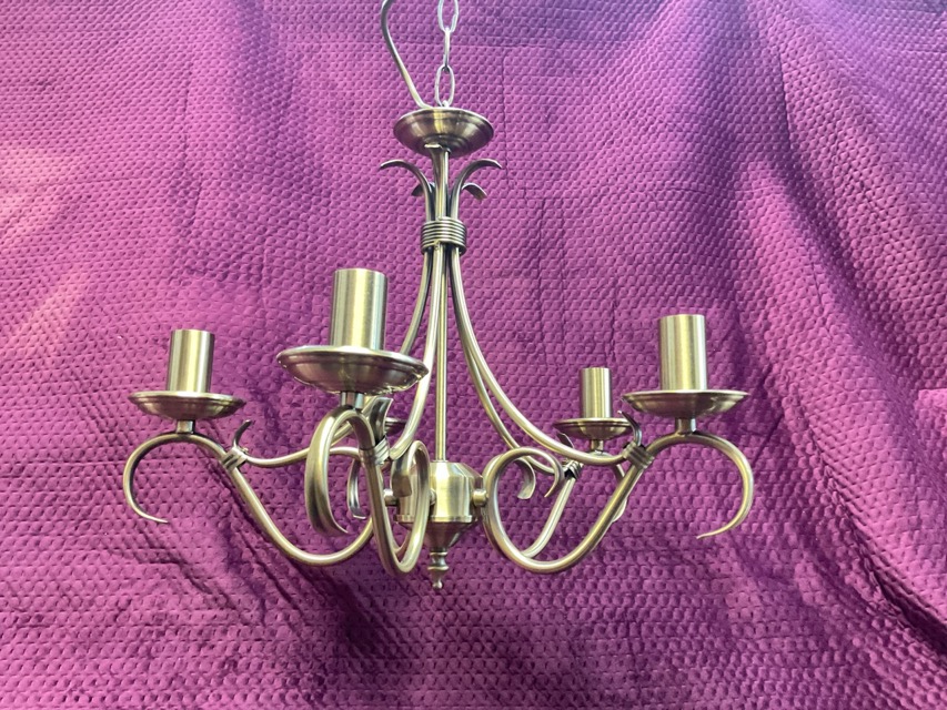 A new and unused Endon Belinda brass five-light chandelier with domed ceiling rose and chain suspending a tubular column with scrolled arms supporting moulded circular drip pans with cylindrical bulb holders. (27in)