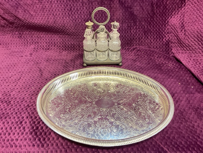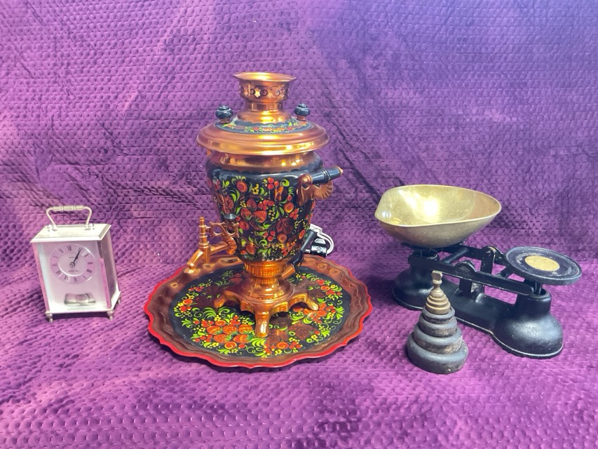 A set of Salter cast iron kitchen scales with weights and brass bowl, an Acctim hour striking quartz carriage clock, a Russian tinplate electric samovar and tray handpainted with fruit and flowers, an oval silver plated tray with pierced gallery, and a rectangular Victorian silver plated six-bottle cruet. (6)