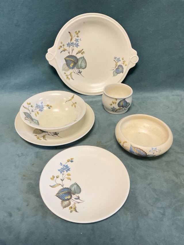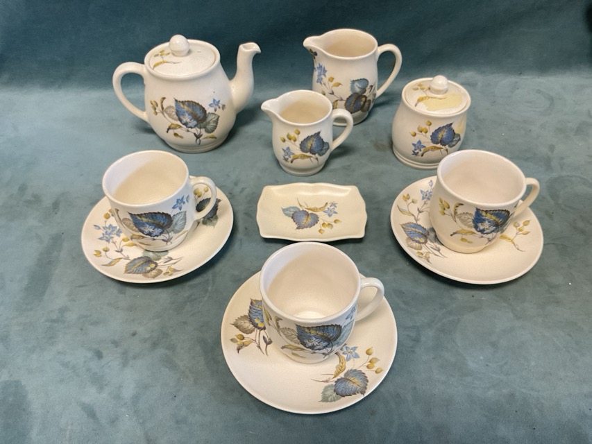 An extensive Sylvac ceramic rea and coffee service in the Lime Grove pattern with a teapot, cream and sugar jugs, sugar bowls jam pots, tea plates, cake plates, teacups, saucers, mugs, bowls, etc. (A lot)