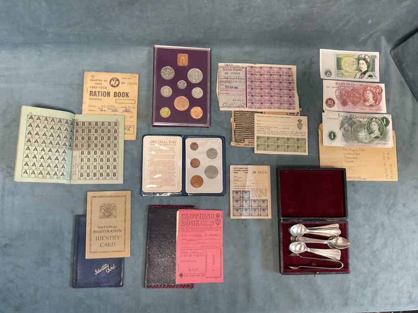 Miscellaneous collectors items and ephemera - 1970 and 1971 coinage, £1 and 10s notes, 40s ID card, clothing, furniture and food ration coupons, silver plated soup and coffee spoons, Mabel Lucy Atwell household notices, prayerbook and crucifix, blank government issued notebooks, etc. (A lot)