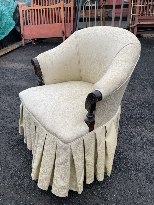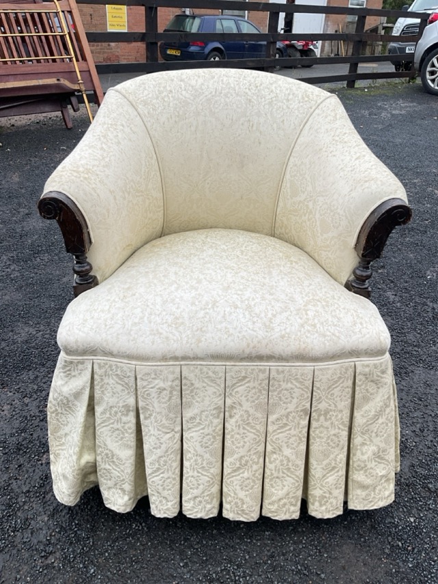 A Victorian upholstered stained beech armchair with horseshoe back and arms outscrolled arms on turned supports above a bowfronted seat raised on turned legs with castors.