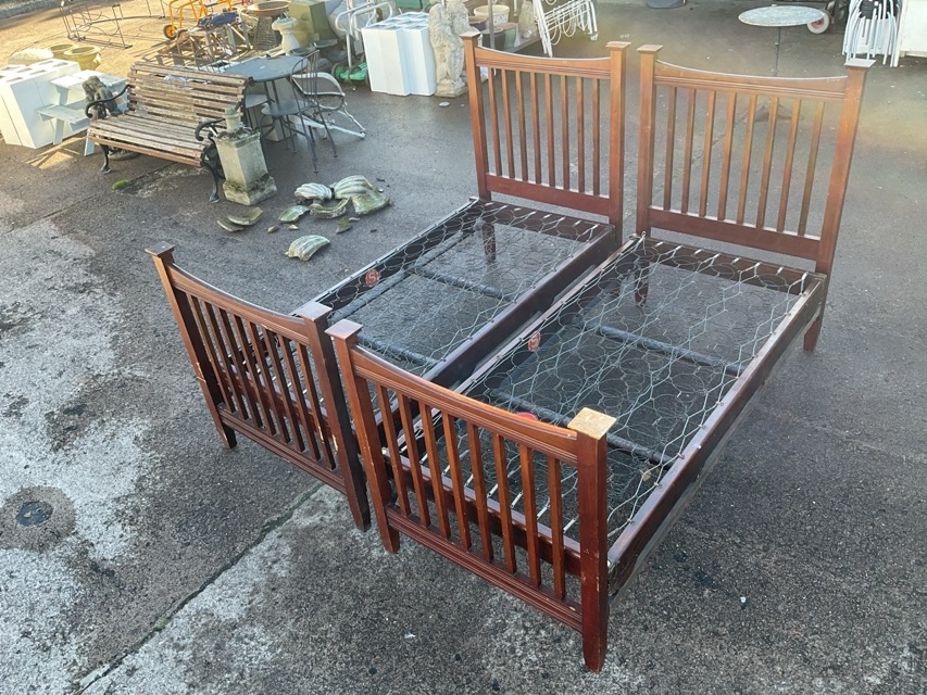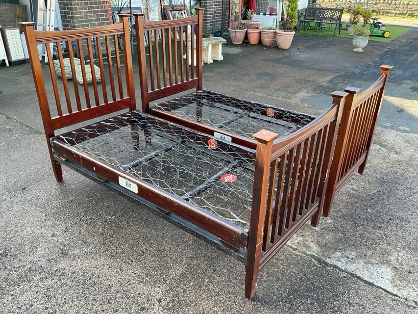 A pair of Edwardian mahogany single beds by Staples & Co., the head and footboards with moulded crestrails above slats flanked by square posts with moulded capitals joined by angle irons supporting sprung bases. (37.25in x 81.25 x 51.2in) (2)