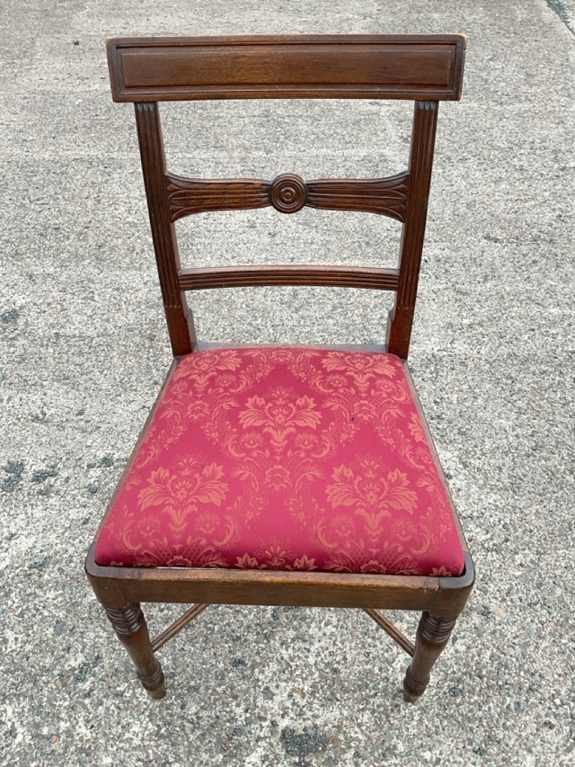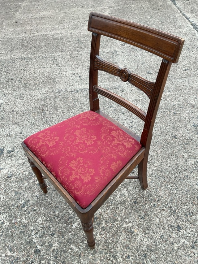 A regency mahogany chair with tablet crestrail and leaf and roundel carved rail above a drop-in upholstered seats raised raised on turned tapering legs joined by am X-stretcher.