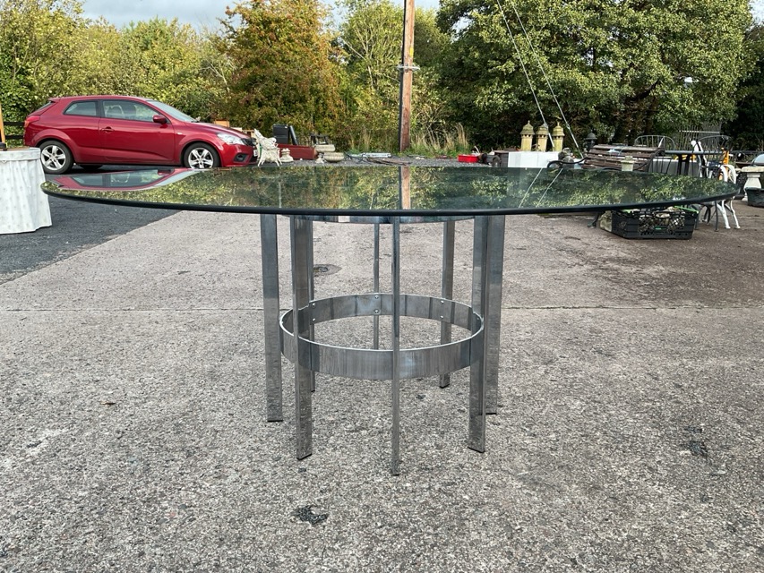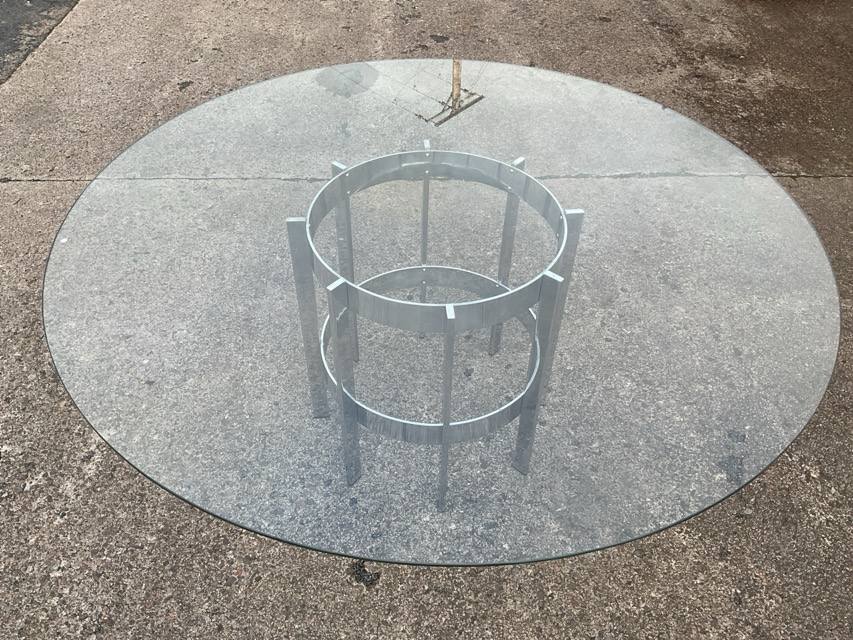 A 70s Merrow Associates dining table designed by Richard Young, titled The Preece, the glass top raised on cylindrical chromed support with rectangular columns. (66in x 28in)