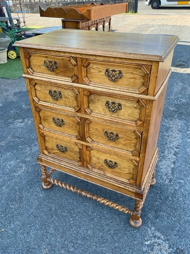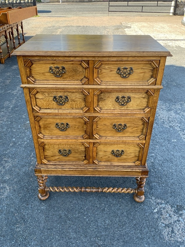 A William & Mary style oak chest of drawers, the rectangular moulded top above four drawers with brass handles & escutcheons, raised on barleytwist legs with bun feet, joined by stretchers. (30in x 17.75in x 42in)