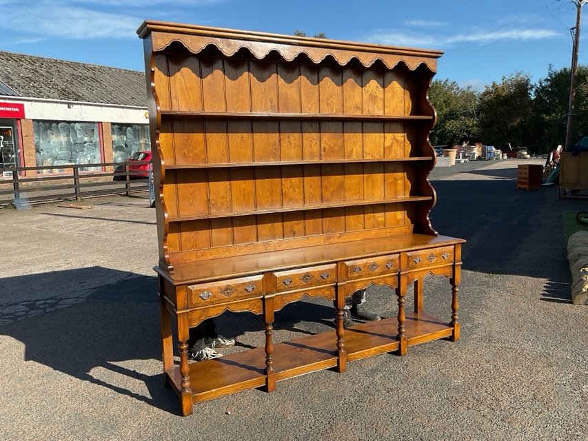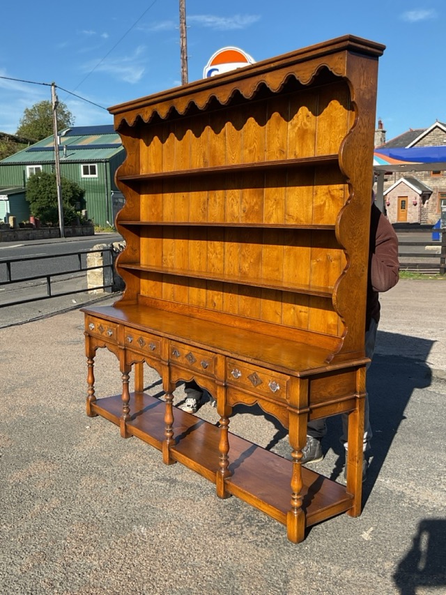 A Georgian style oak dresser, the scalloped delft rack with three reeded shelves on moulded rectangular surface having four drawers, raised on turned legs with block feet, joined by undershelf. (85in x 18.25in x 84.5in)