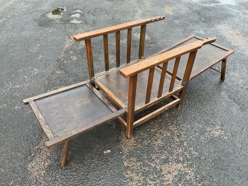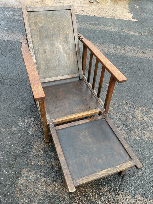 An unusual 30s oak armchair with platform arms on lathes above a seat, converting from chair to lounger or bed.