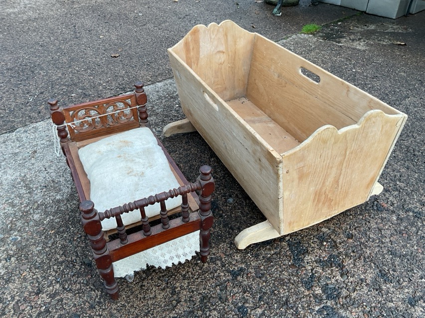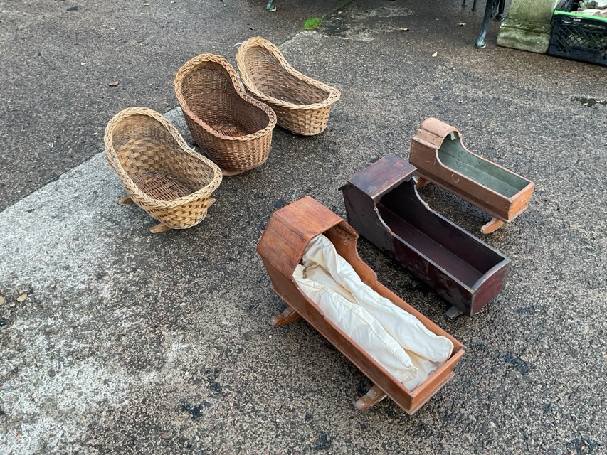 Eight cradles - a mahogany dolls bed, three similar cane dolls cradles, three hooded with rectangular bodies, a pine cradle of nailed plank construction with shaped head & footboards, etc. (8)