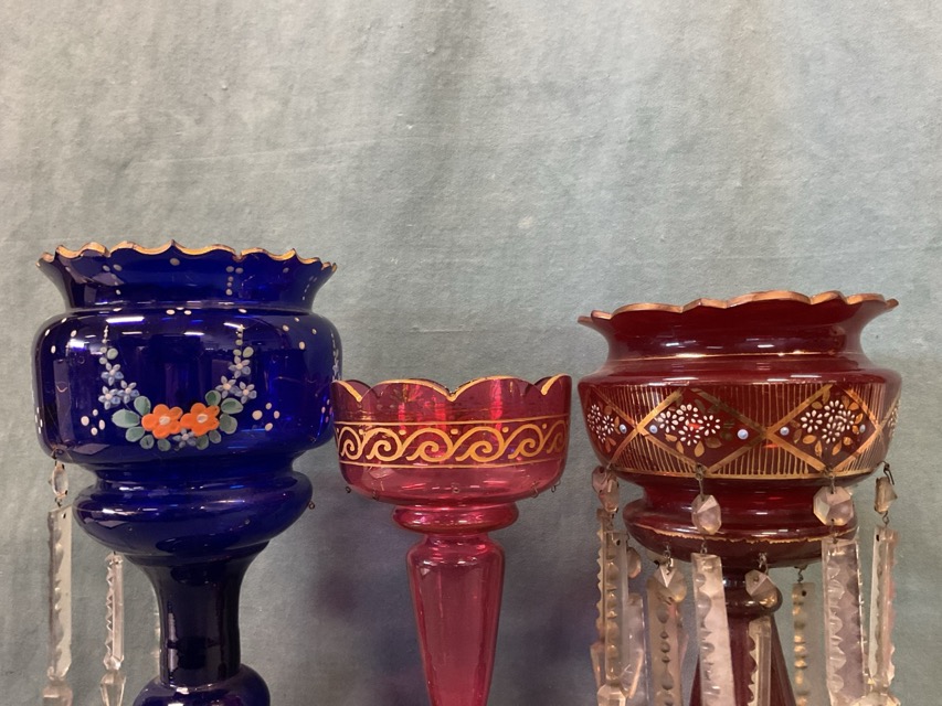 Three Victorian glass table lustres in ruby, bristol blue & cranberry, having scalloped bowls on columns, decorated with gilding and floral enamelling. (14in, 12.5in & 11.25in) (3)