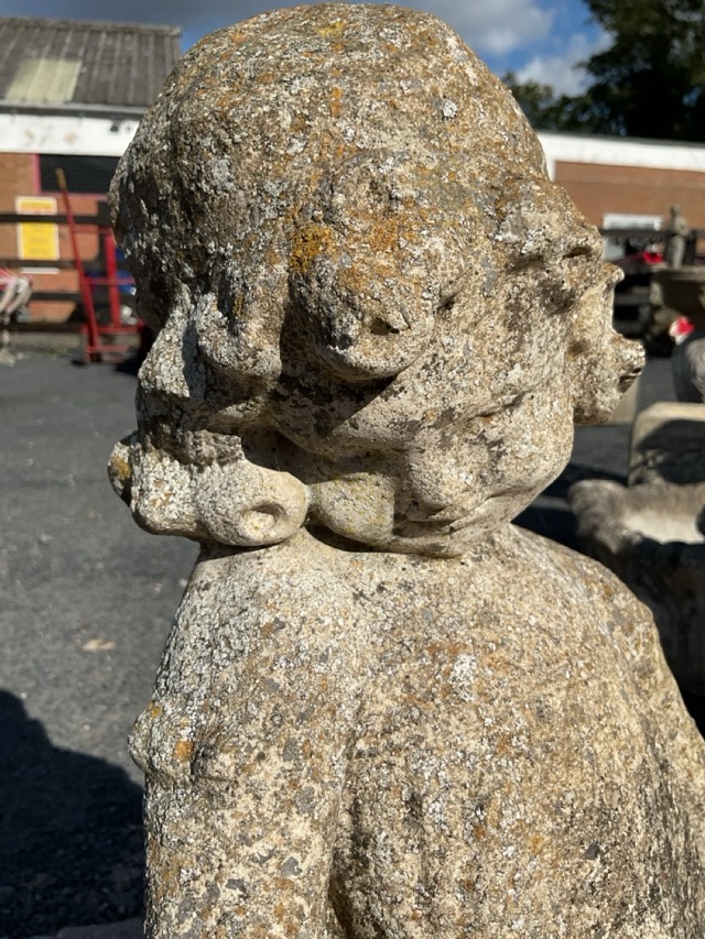 A composition stone garden statue modelled as a thirties child in bonnet & dress, standing on rectangular moulded plinth. (24in)