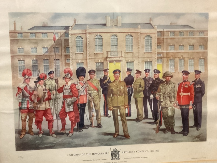 CC Stadden, limited edition coloured print depicting uniforms of The Honourable Artillery Company, the plate numbered in pencil on margin, mounted & gilt framed. (25in x 18.75in)