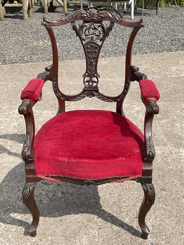 A late Victorian carved salon chair with acanthus shell back above a pierced ribbon splat, the conforming arms with elbow pads, above a sprung upholstered seat, raised on cabriole legs.