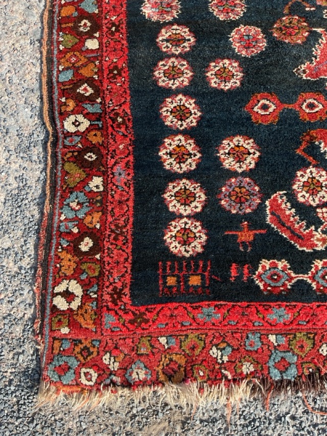 An antique Malayer wool prayer rug woven with symmetrical scrolled floral decoration between rows of flowerheads on a dark blue field, within meandering flowering vine borders. (39in x 84.75in)