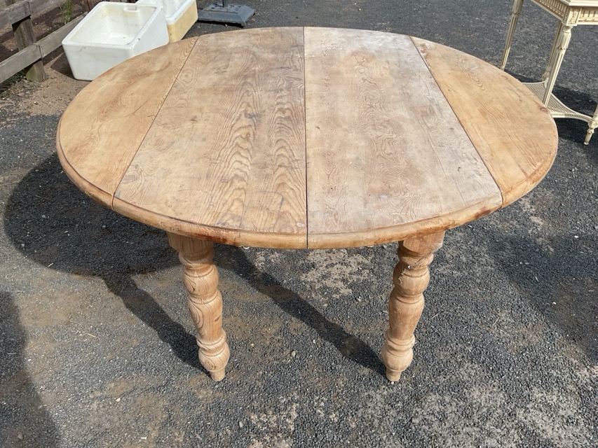 An extending pine farmhouse kitchen table with two leaves to circular top, raised on bulbous turned legs. (48in x 30in round)