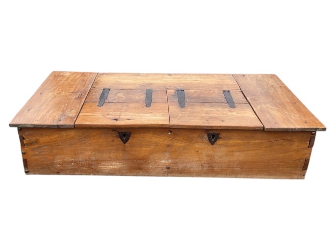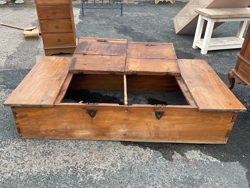 A rectangular hardwood box seat with two hinged covers to dovetailed box, having carriage handles to ends. (65.5in x 34in x 14in)