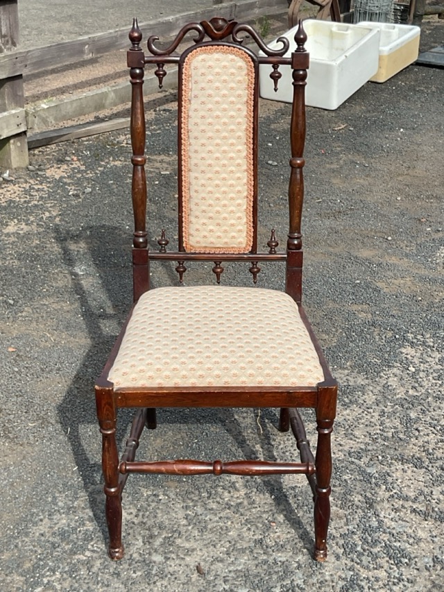 A mahogany William and Mary style parlour chair with scrolled back and padded splat flanked by turned supports with pointed finials, above a drop-in upholstered seat, raised on turned legs joined by conforming stretchers.