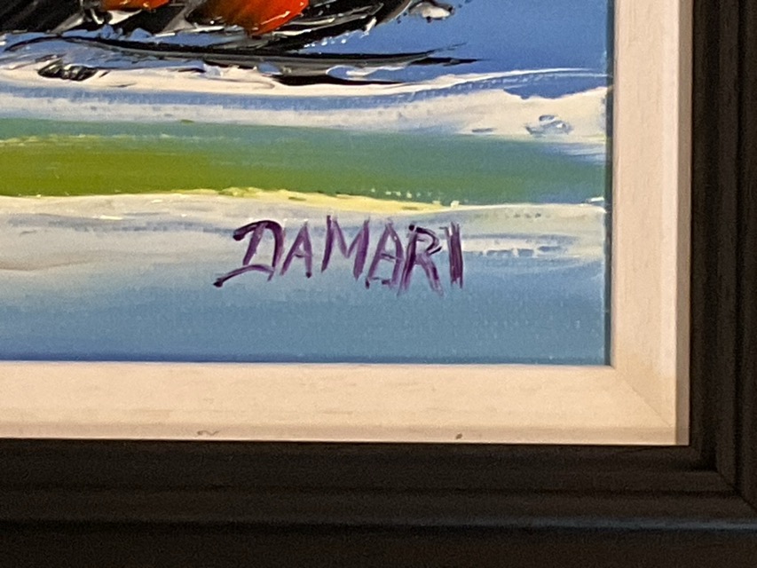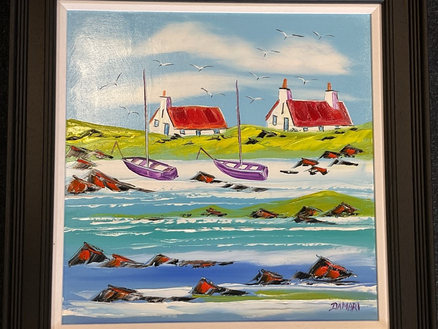John Damari, oil on canvas, coastal scene with cottages and beached boats, titled Sailing Boats on the Isle of Lewis to verso, signed and framed. (15in x 15in)
