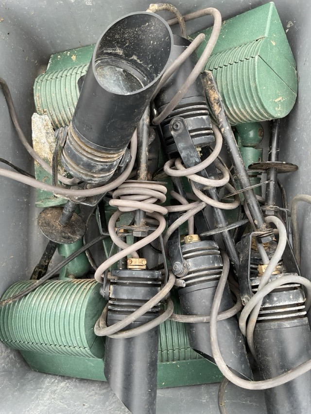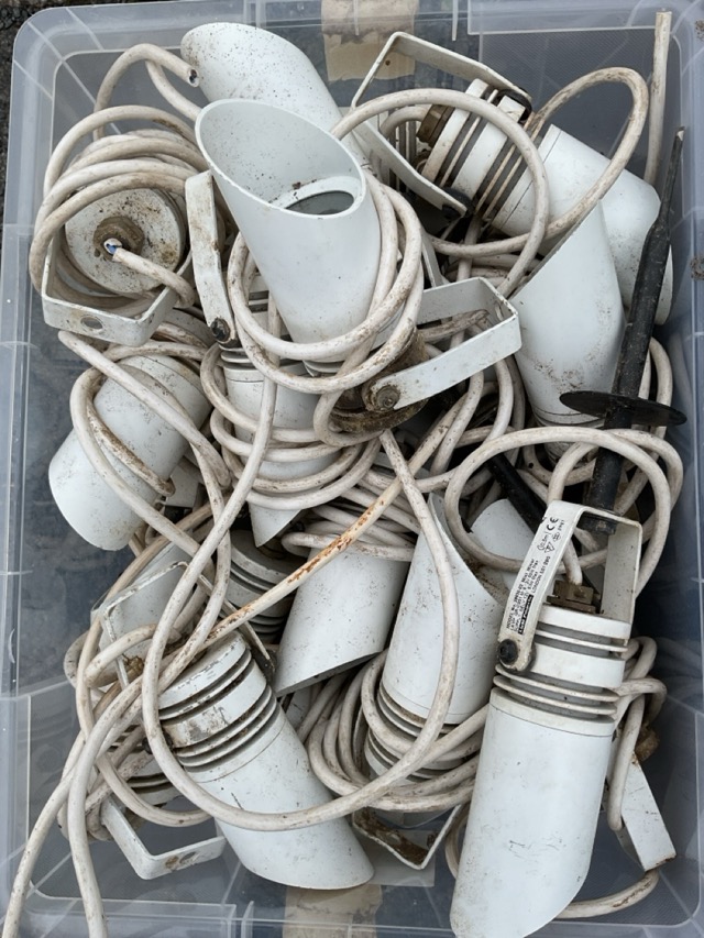 Miscellaneous sets of outdoor lights with cables - tubular on brackets with stakes, ribbed floodlight type, etc. (A lot)