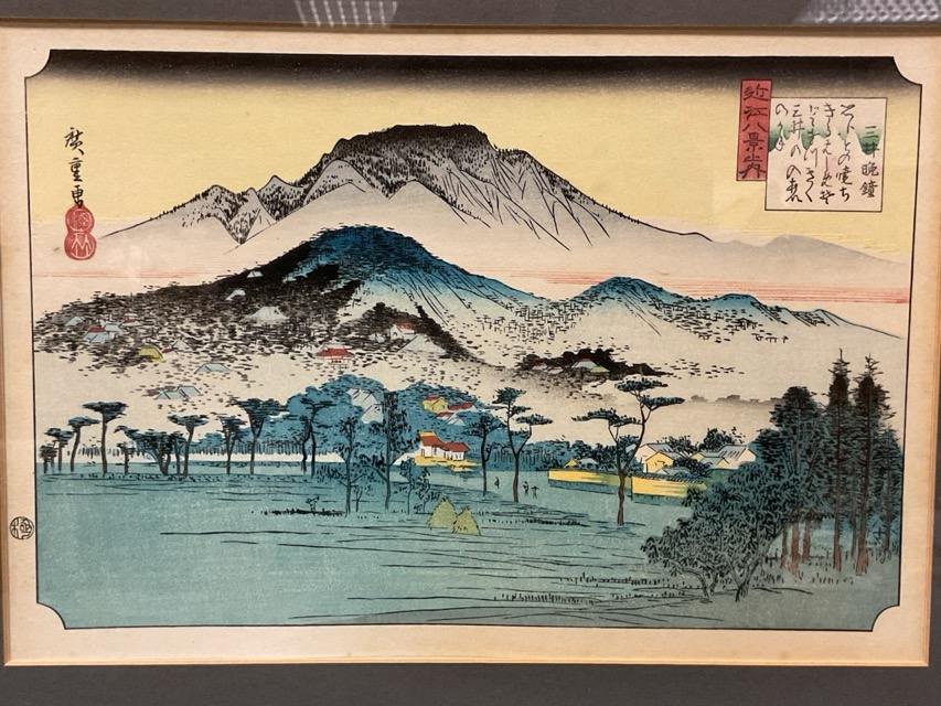 Utagawa Hiroshige, a pair of C20th Japanese woodblock reprints from the series Eight Scenic Views of Mount Ohmi, depicting the Mini temple & Awazu, signed, mounted & framed; and another reprint by the same artist depicting a lady in the snow at Asakusa. (3)