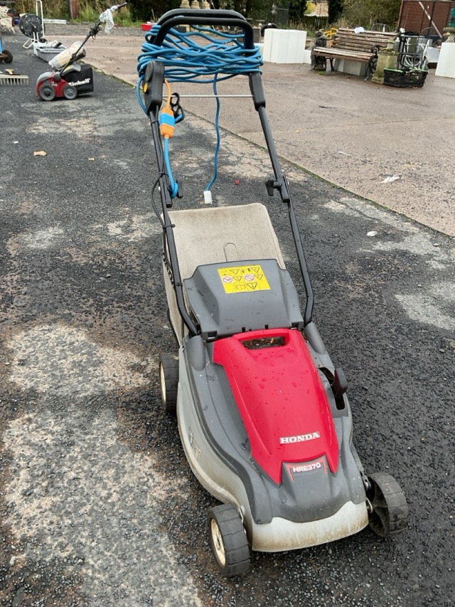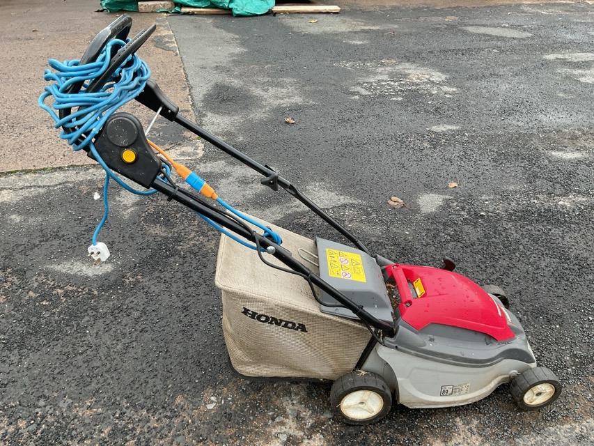 A Honda electric rotary garden mower - model HRE370, with extension cable, adjustable wheels, fabric grassbox, etc.