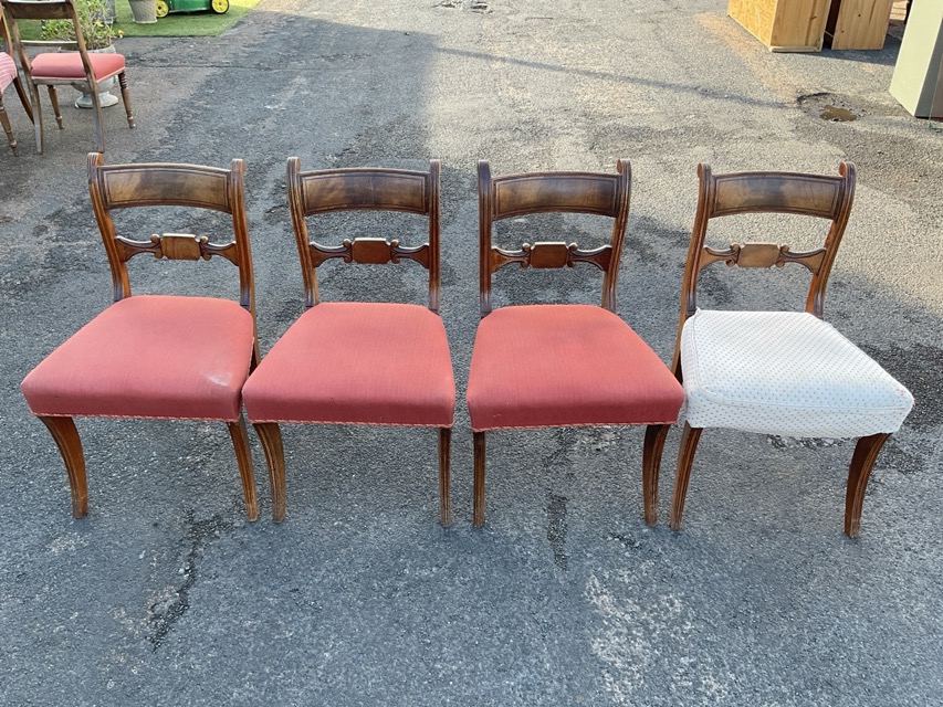A harlequin set of six regency mahogany dining chairs, four with moulded tablet crestrails, scroll and tablet rails above upholstered seats raised on sabre legs, a similar armchair on turned legs and another chair with plain rail on turned legs. (6)