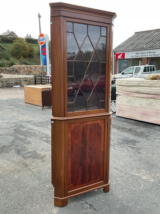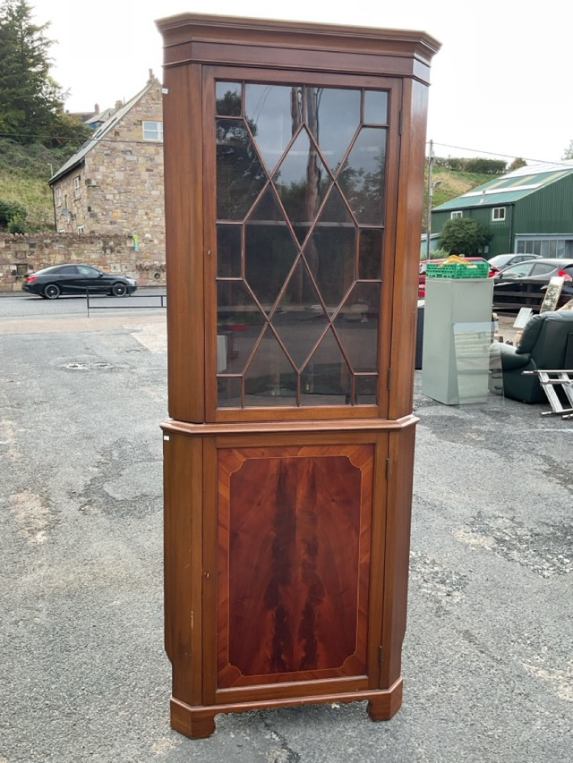 An Edwardian mahogany Georgian style corner cabinet with moulded cornice above an astragal glazed door enclosing shaped shelves on a base with boxwood strung crossbanded door raised on bracket feet. (33in x 18in x 84in)