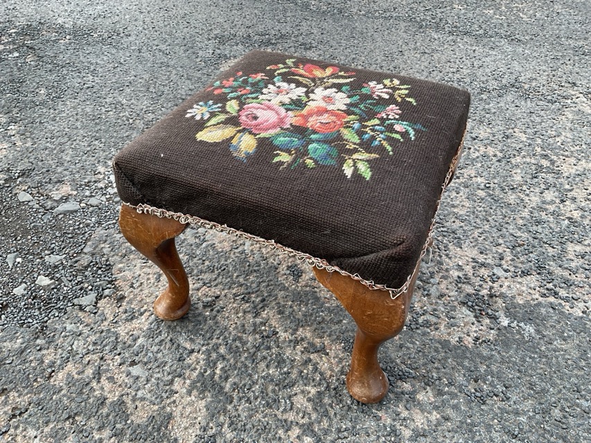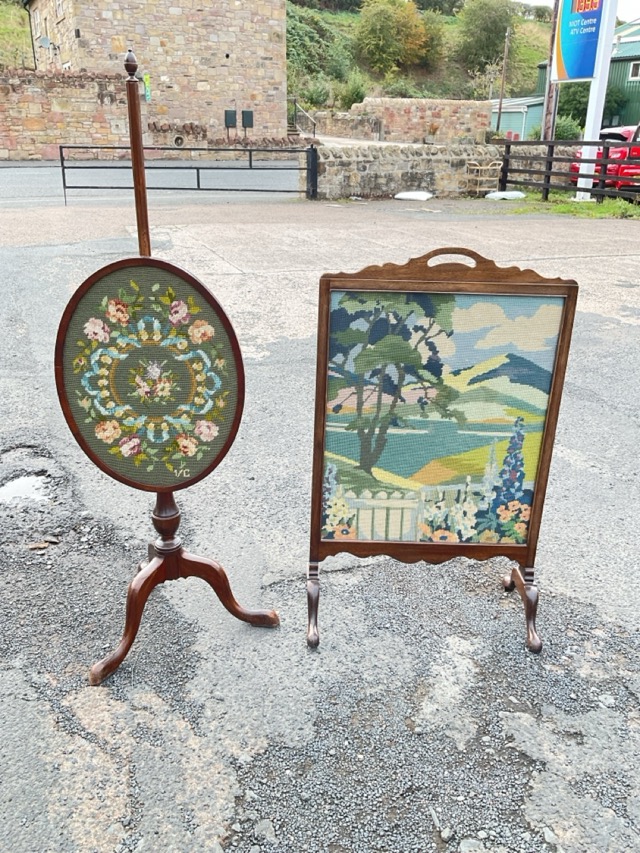 A Georgian style mahogany polescreen with oval woolwork tapestry panel raised on a tripartite base with cabriole legs; a rectangular mahogany fire screen with pierced shaped crest raised on cabriole legs; and a rectangular woolwork tapestry upholstered footstool raised on cabriole legs. (3)