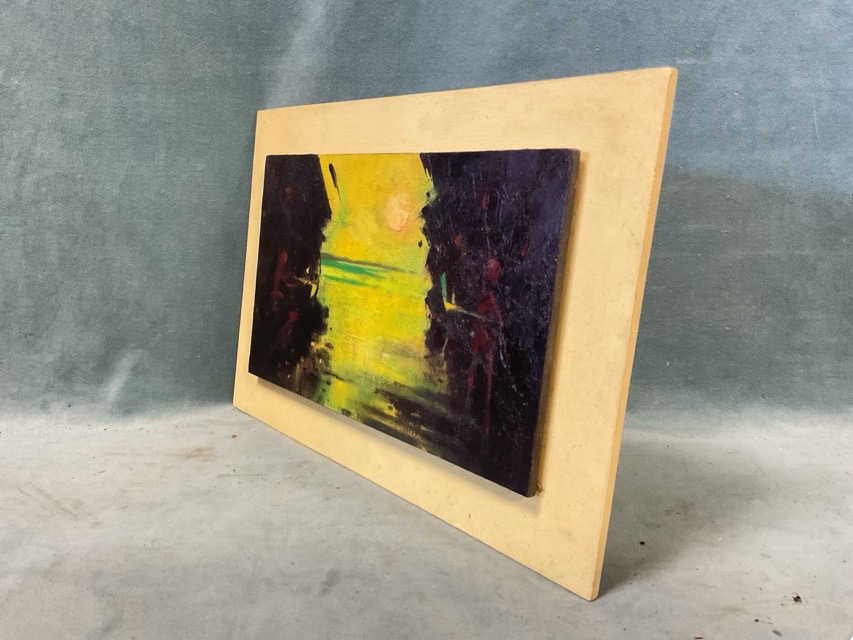 Oil on board, sunset over water, unsigned, float mounted on board. (10.75in x 6.5in)