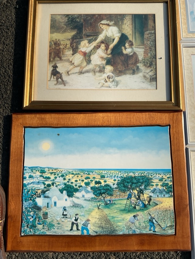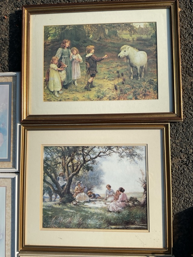 Eight miscellaneous framed prints - Victorian style, a set of three floral, continental harvesting, etc. (8)