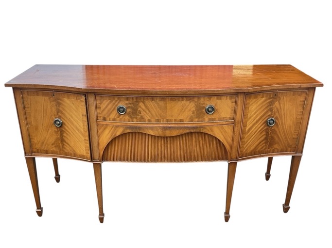 A regency style mahogany serpentine fronted sideboard with crossbanded top above a brass ring handled cockbeaded drawer and faux tambour fronted drawer, flanked by cupboards, raised on tapering square legs with spade toes. (68in x 23in x 36.25in)