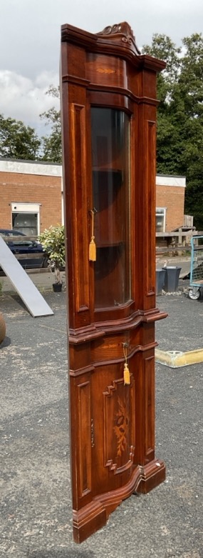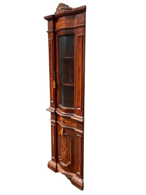 A European mahogany bowfronted corner cabinet with moulded carved crest cornice above a leaf inlaid frieze, with glass door framed by rectangular moulded panels, the base with conforming floral marquetry inlaid drawer and panelled door, supported on a moulded plinth. (26in x 15.5in x 82in)