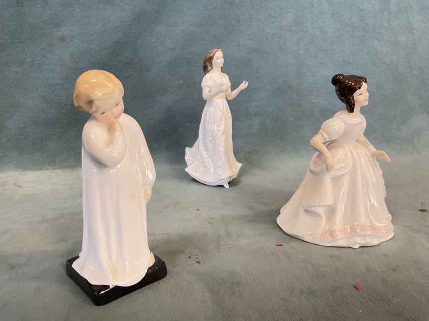 Two Royal Doulton figurines - Mary Had a Little Lamb HN2948 and Darling HN1985; and five Doulton Collectors figures - Bunnykins Bunnys Bedtime HN3370, Melody HN4117, Joy HN3875, Sentiments Greeting HN4250, and Amanda HN3635. (7)