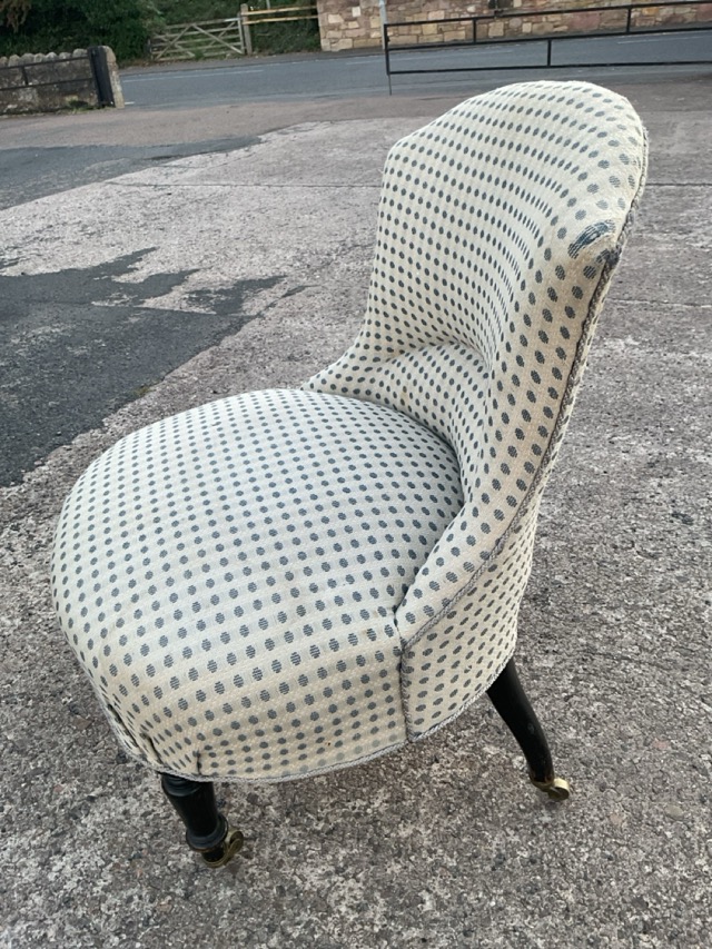 A late Victorian chair with contemporary upholstery, having shaped back and bowfronted sprung seat, raised on ebonised turned legs with brass caps & castors.