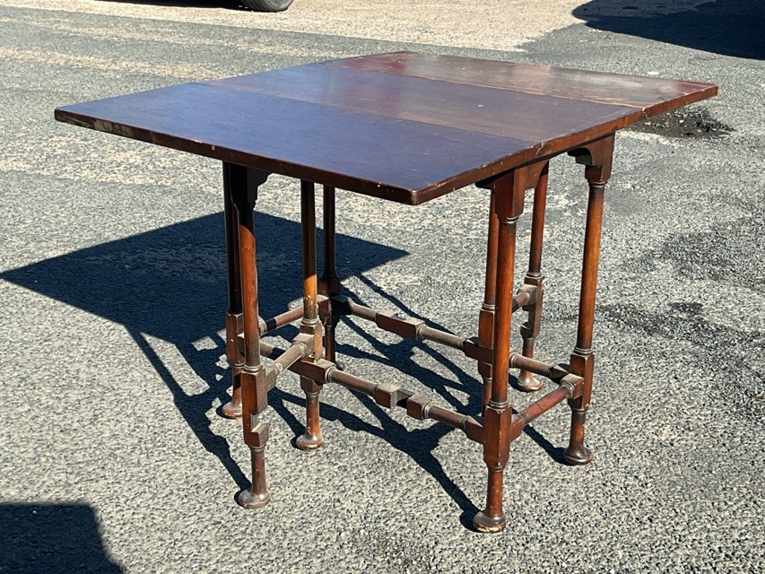 A mahogany Georgian style spider leg table with two leaves opening on gate legs, raised on turned column supports with pad feet joined by conforming stretchers. (27in x 21.5in x 19.75in)