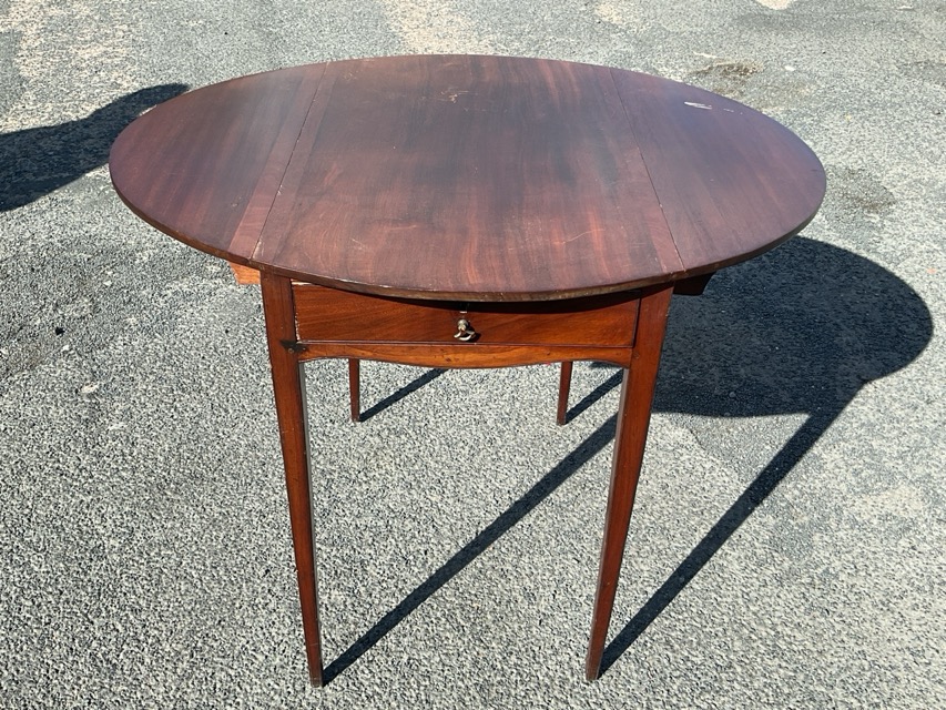 A Georgian mahogany pembroke table with oval top and two leaves opening on brackets, above a brass handled frieze drawer opposite a dummy drawer, raised on tapering square legs. (35in x 29.25in x 27.5in)