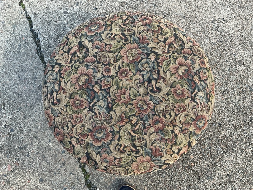 A floral tapestry fabric upholstered pouffe with circular cushion seat and tapering base.