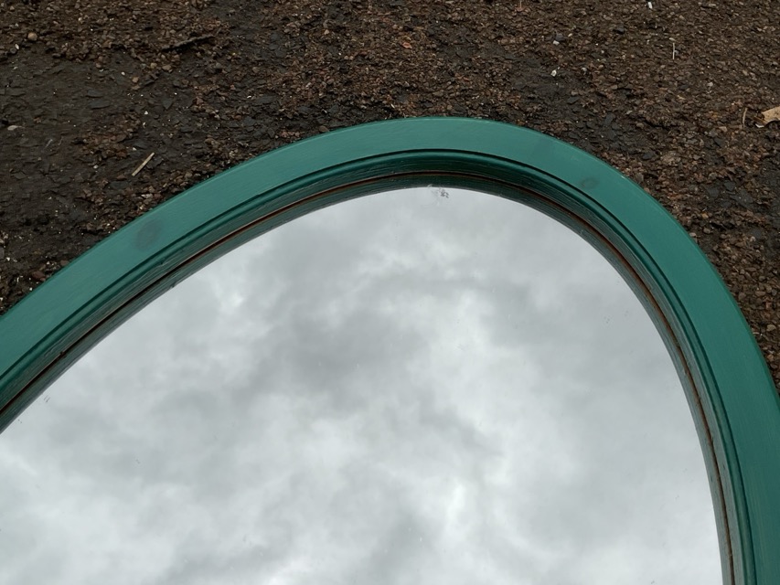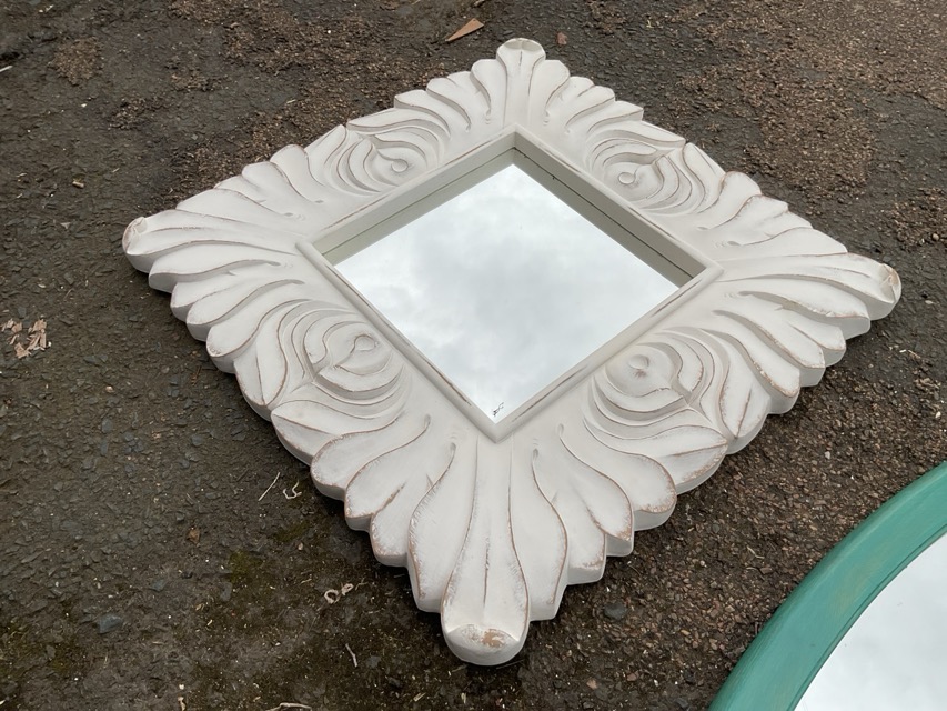 A modern square mirror in deep leaf moulded painted frame - 23.5in; and an oval mirror in painted frame - 39in. (2)